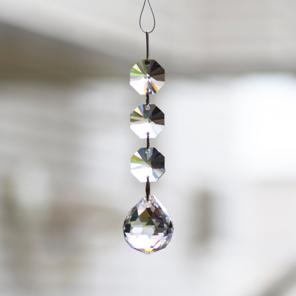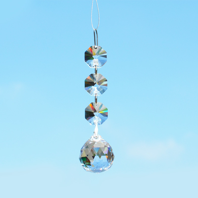 クリスタル製のガラス玉を使いストラップのように作成したものを窓辺など太陽の光が直接当たる場所にぶら下げると、クリスタルで乱反射した光が虹の粒となって部屋に入ってきます。