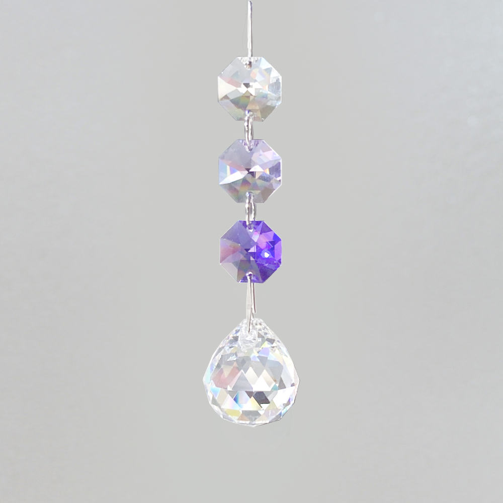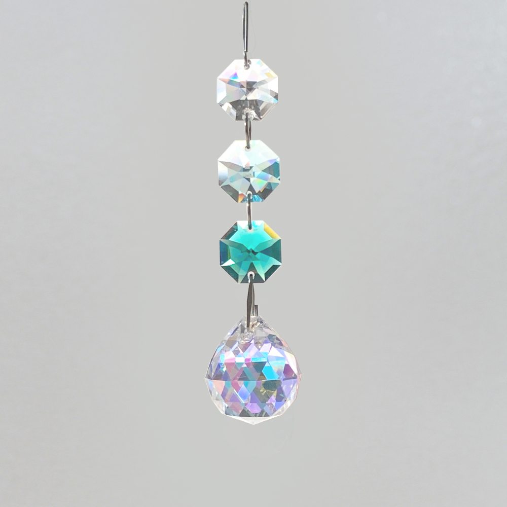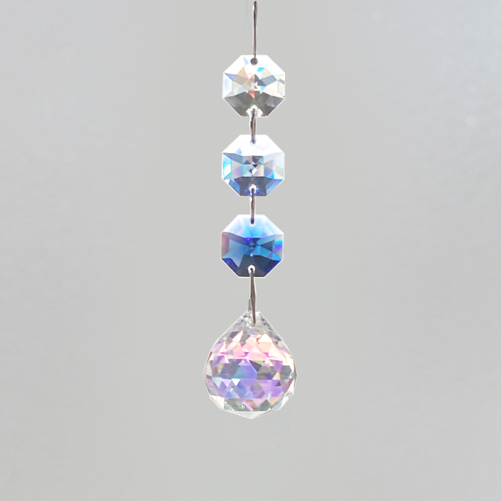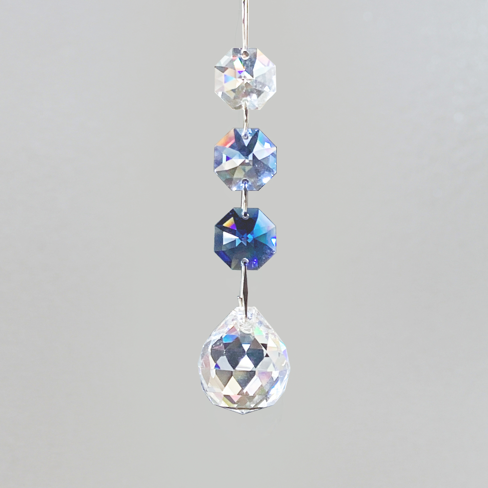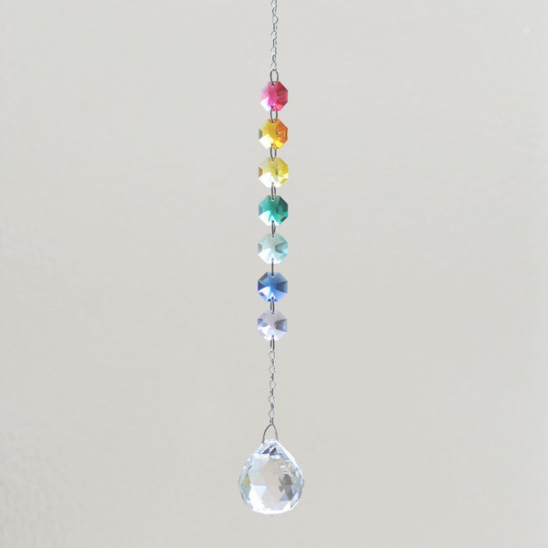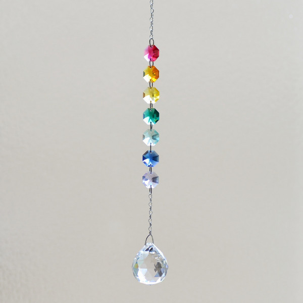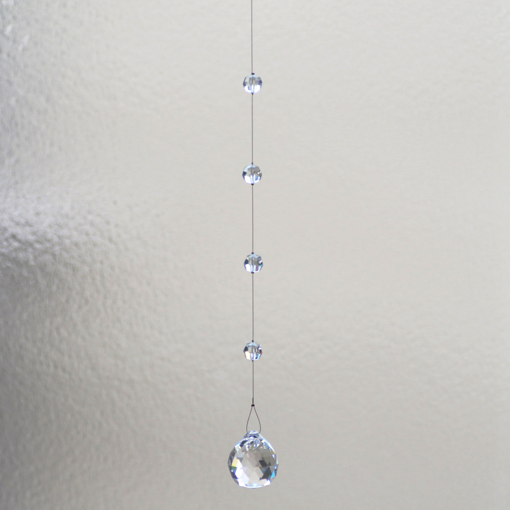 クリスタル製のガラス玉を使いストラップのように作成したものを窓辺など太陽の光が直接当たる場所にぶら下げると、クリスタルで乱反射した光が虹の粒となって部屋に入ってきます。