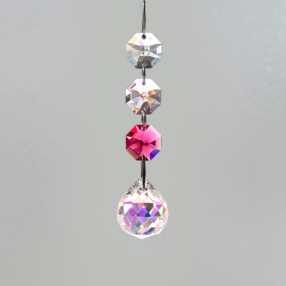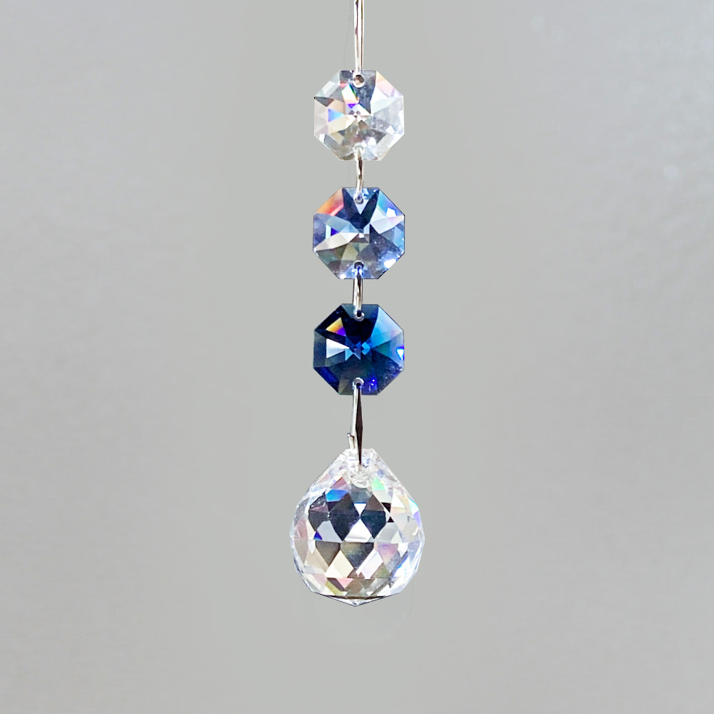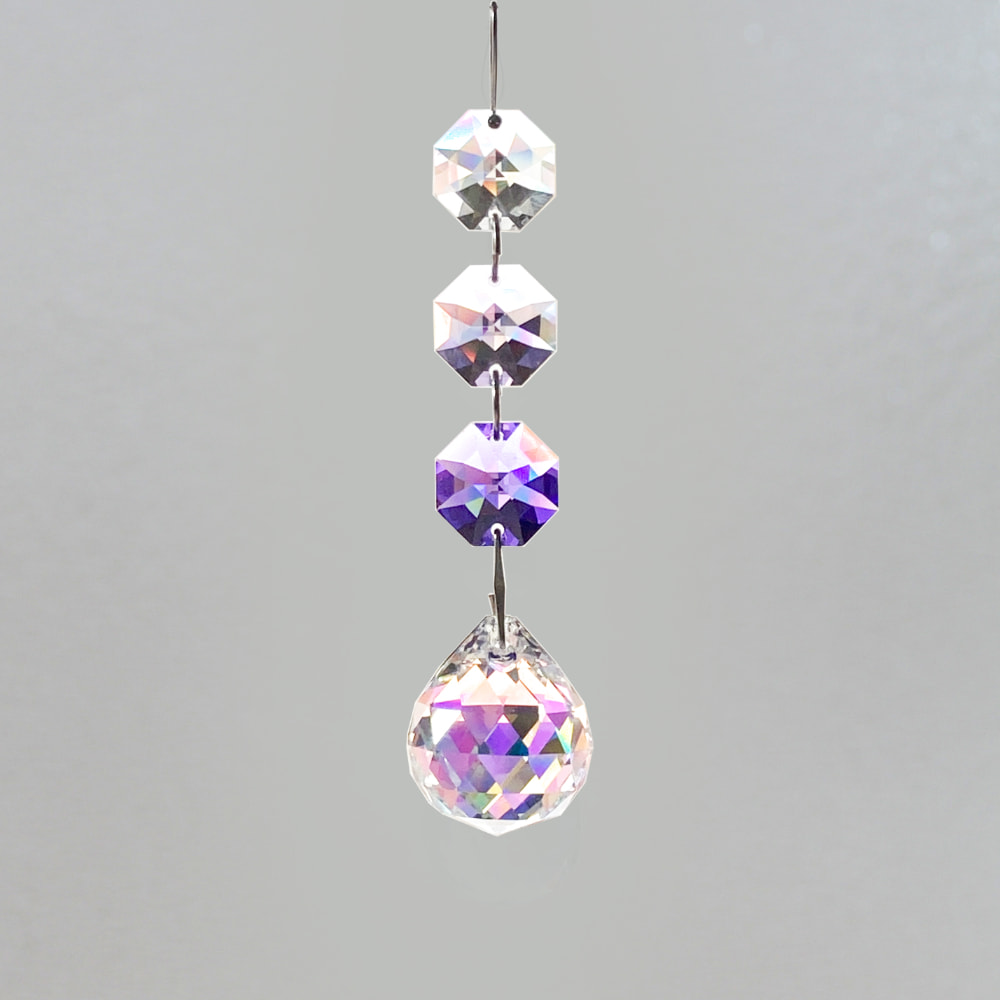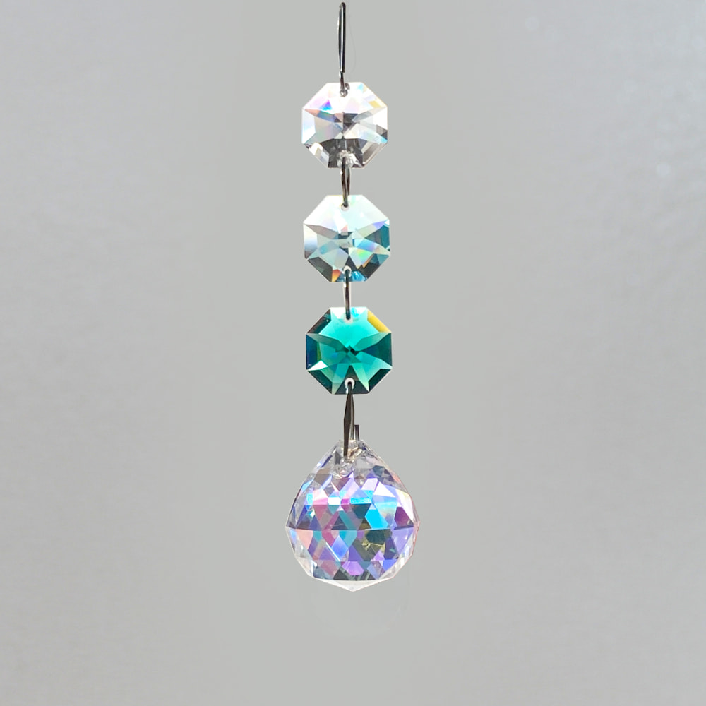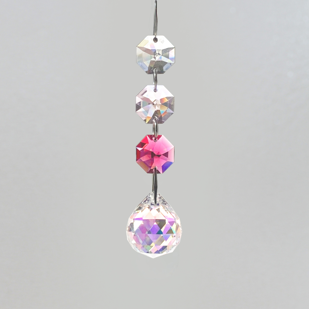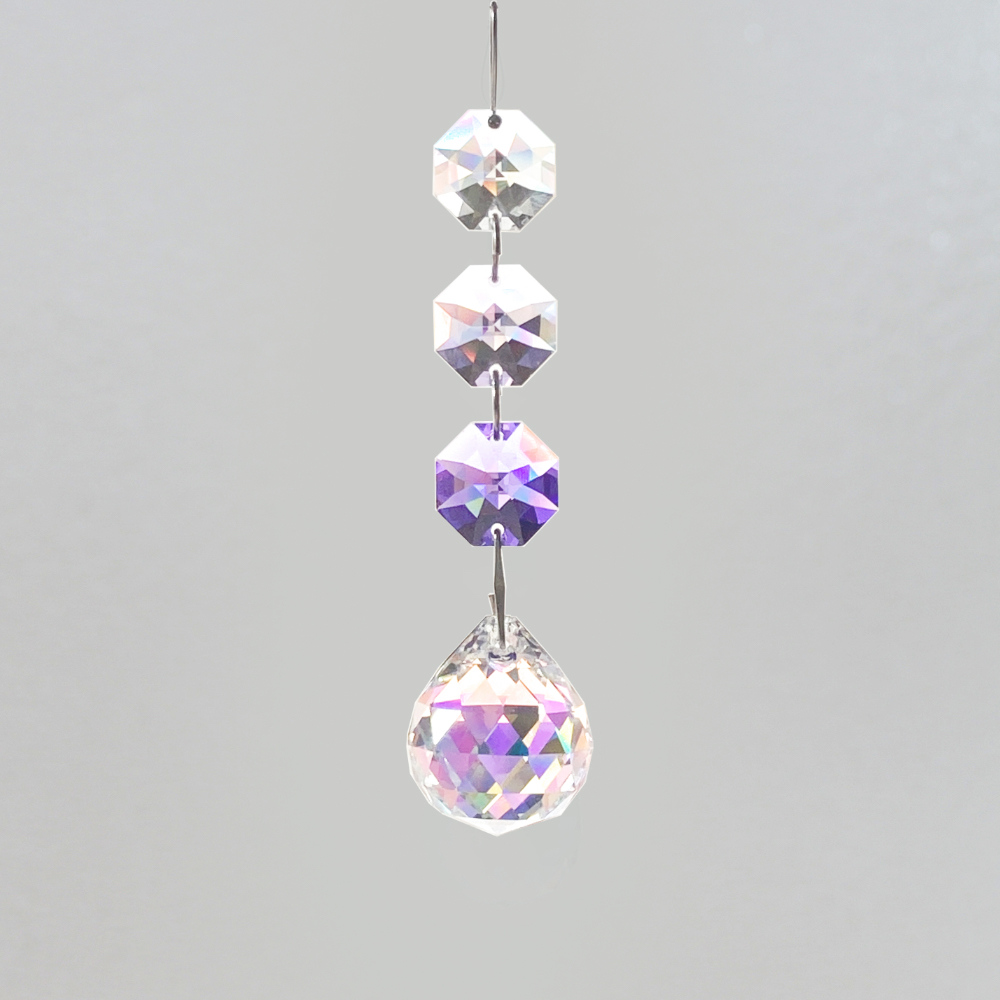 クリスタル製のガラス玉を使いストラップのように作成したものを窓辺など太陽の光が直接当たる場所にぶら下げると、クリスタルで乱反射した光が虹の粒となって部屋に入ってきます。