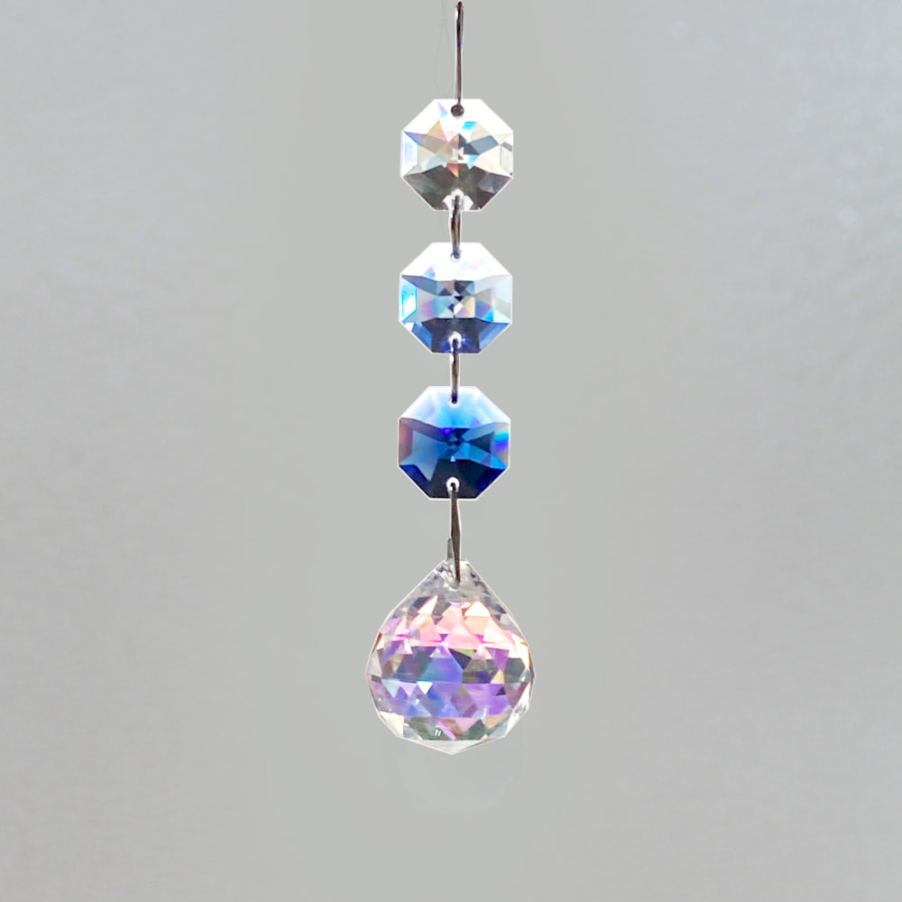 クリスタル製のガラス玉を使いストラップのように作成したものを窓辺など太陽の光が直接当たる場所にぶら下げると、クリスタルで乱反射した光が虹の粒となって部屋に入ってきます。