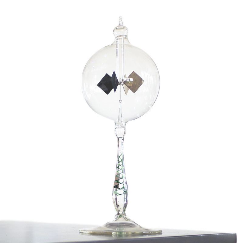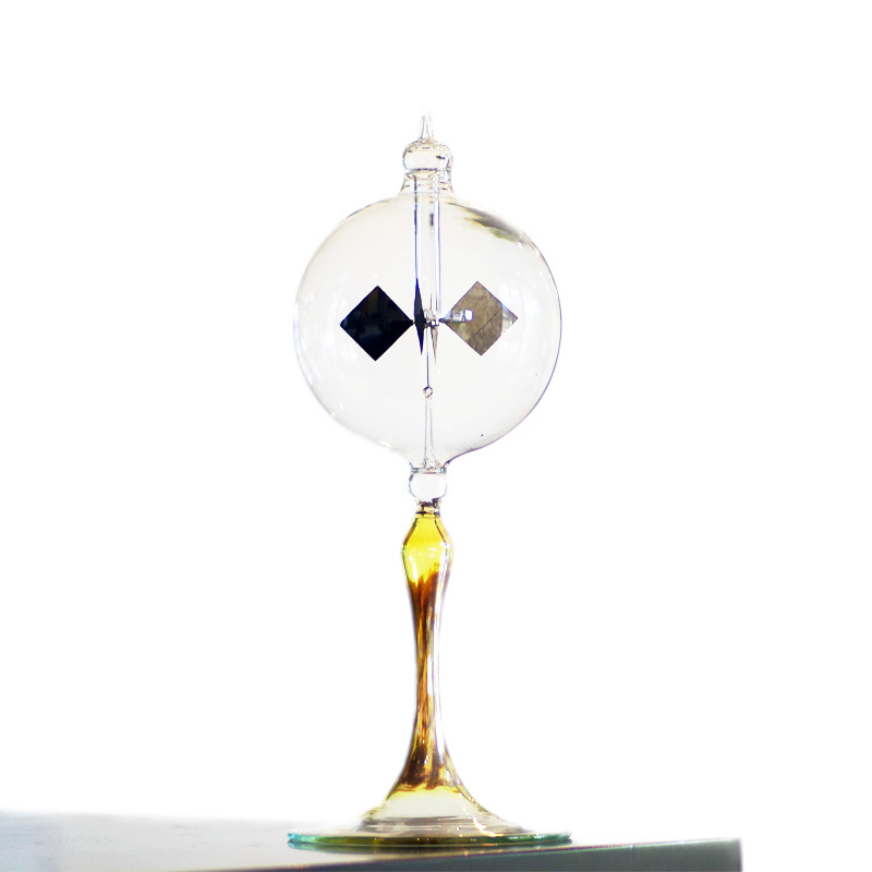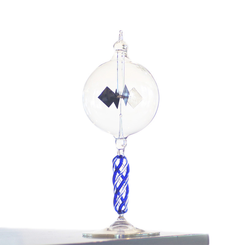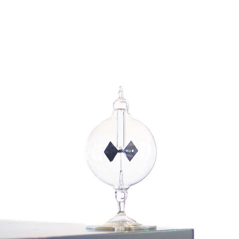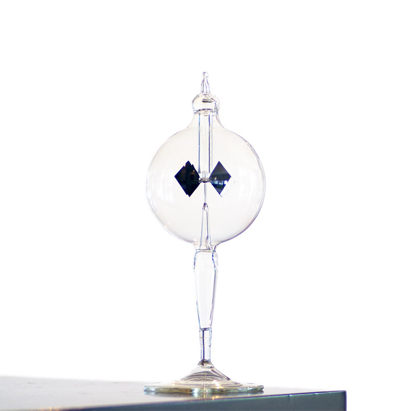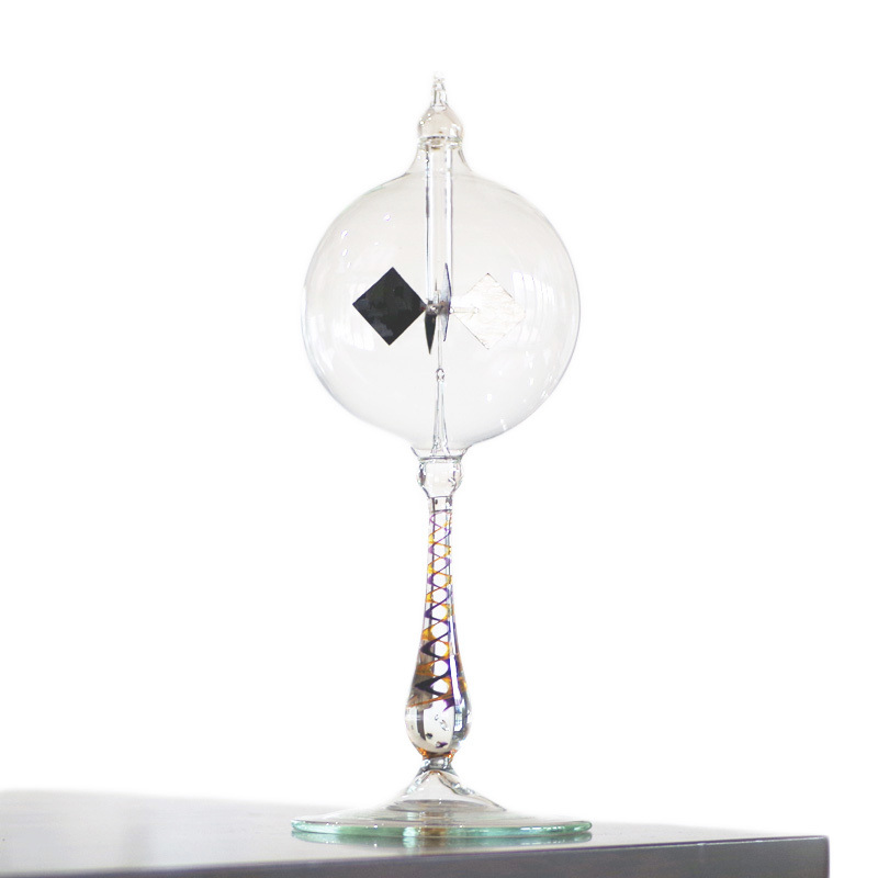 | 使用上の注意 | ・ガラス製品につき衝撃等には破損の恐れがあるため、お取り扱いにはご注意の程お願い致します。また、お子様の手に触れないようにお気を付け下さい。 ・ラジオメーターは赤外線を受けて回転する為、赤外線を含まない光などでは回転しません。回転を楽しみたい場合は、窓辺などの太陽光が当たる場所に置いてください。 |