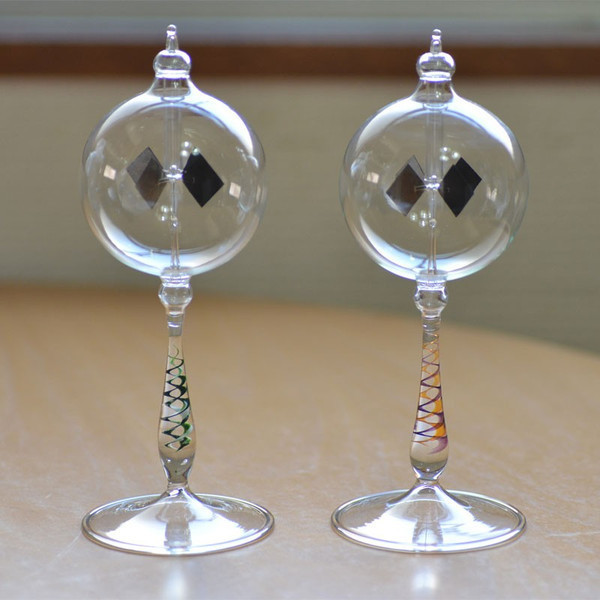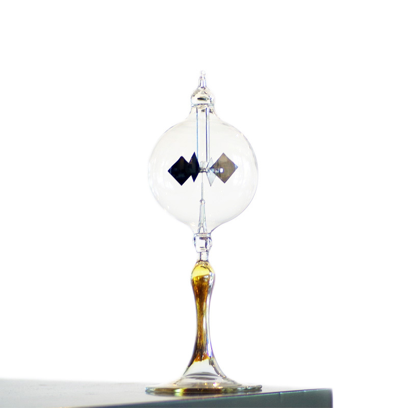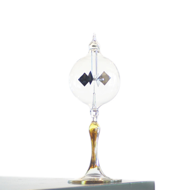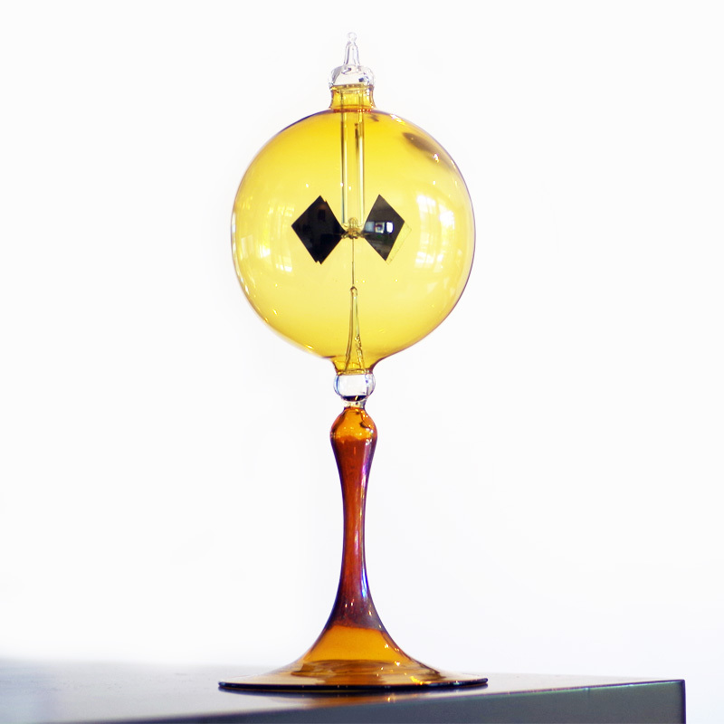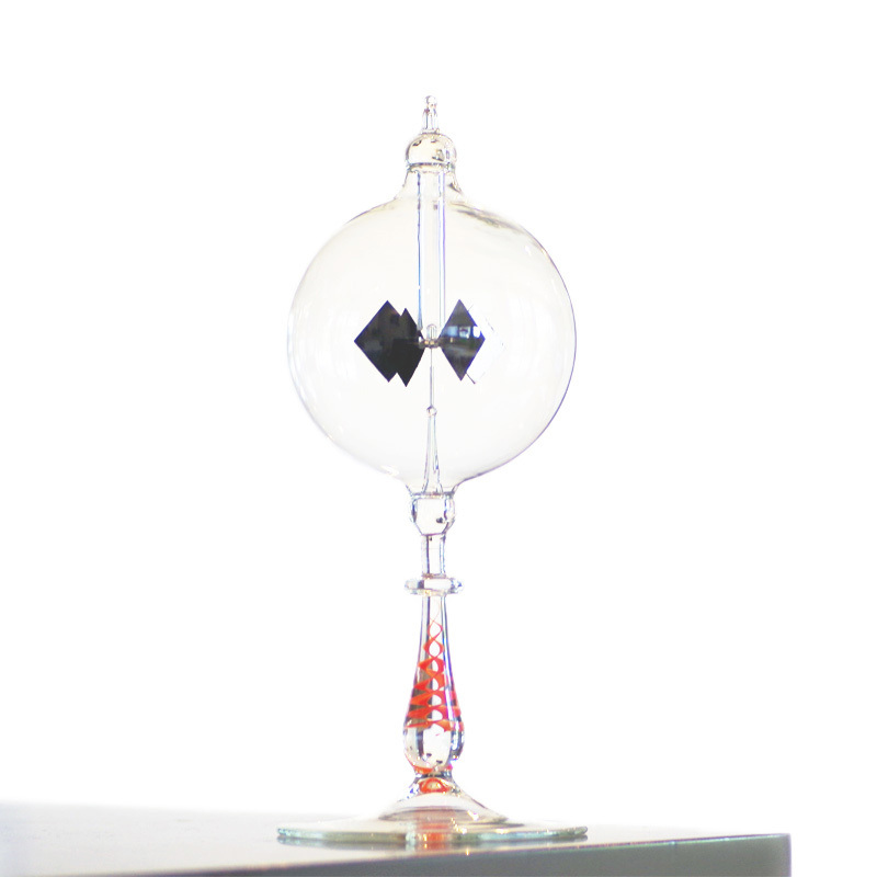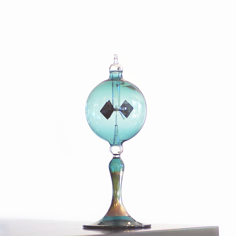 | 使用上の注意 | ・ガラス製品につき衝撃等には破損の恐れがあるため、お取り扱いにはご注意の程お願い致します。また、お子様の手に触れないようにお気を付け下さい。 ・ラジオメーターは赤外線を受けて回転する為、赤外線を含まない光などでは回転しません。回転を楽しみたい場合は、窓辺などの太陽光が当たる場所に置いてください。 |