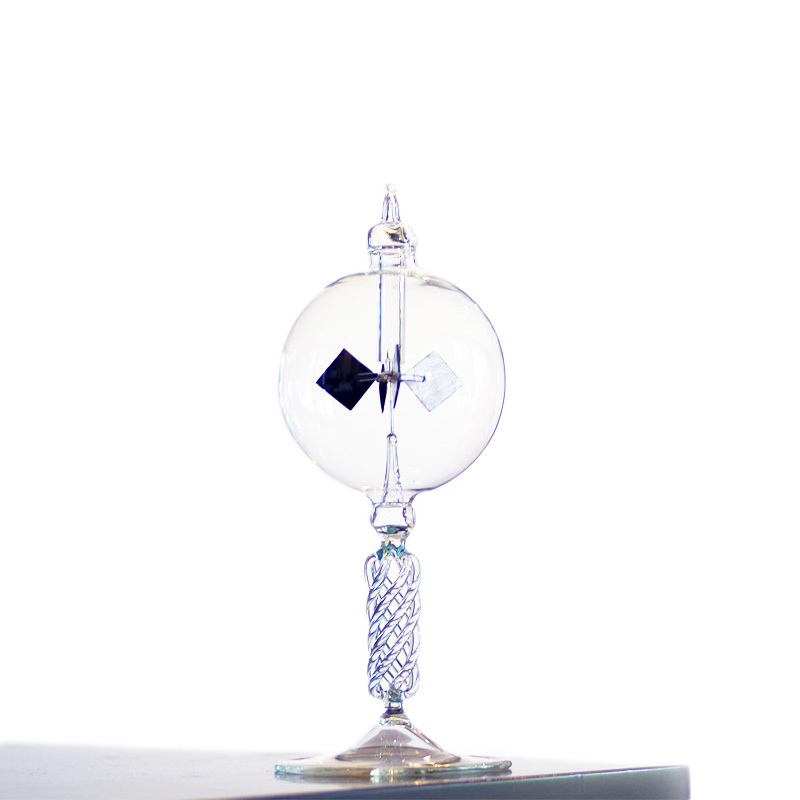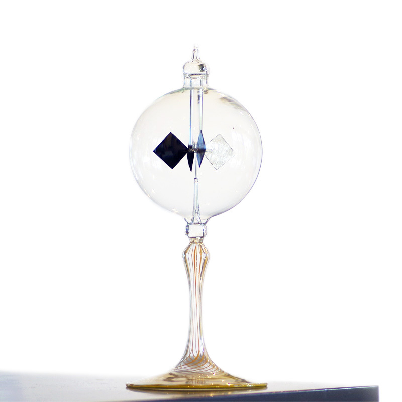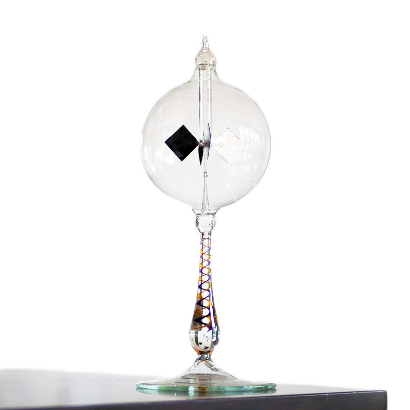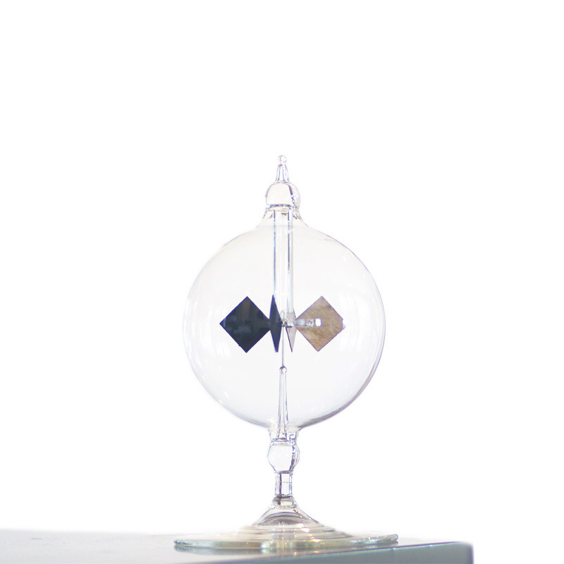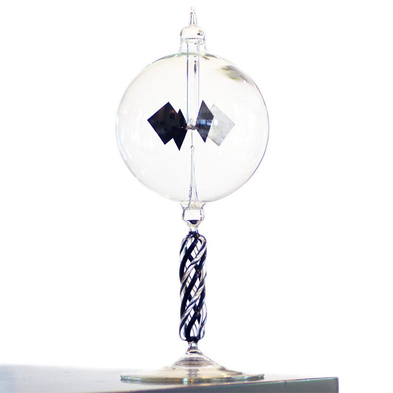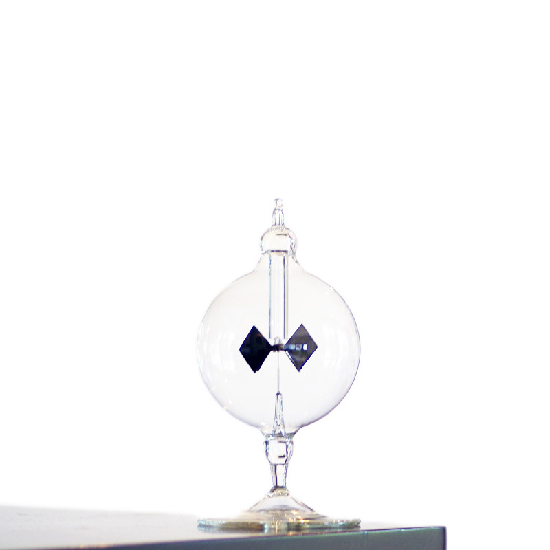 ラジオメーター(別名ライトミル)はイギリスの物理学者ウィリアム・クルックス(1832〜1919)によって発明されました。ソーラー翼の黒い表面 は、白い表面よりも多くの光エネルギーを吸収します。
