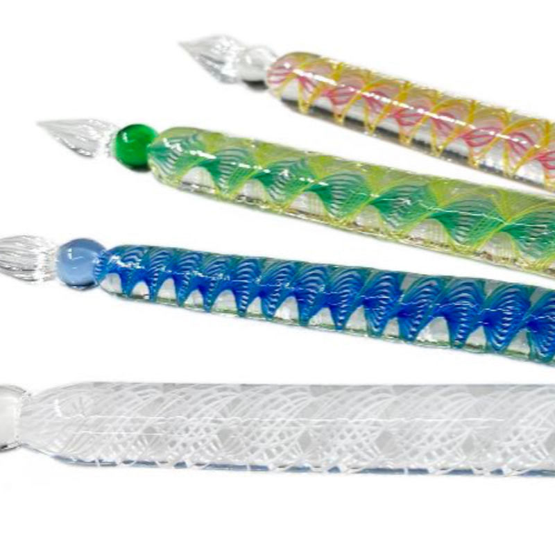 吹きガラス工房「M.U.Glass」で作られたベネチアンレース模様ガラスを用いたペン。