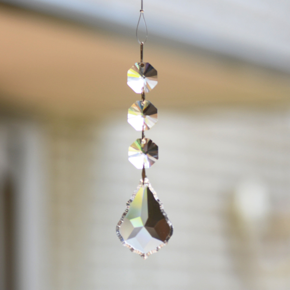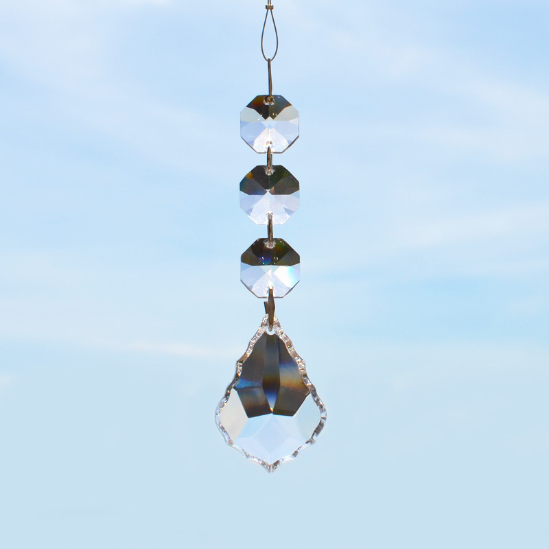 クリスタル製のガラス玉を使いストラップのように作成したものを窓辺など太陽の光が直接当たる場所にぶら下げると、クリスタルで乱反射した光が虹の粒となって部屋に入ってきます。